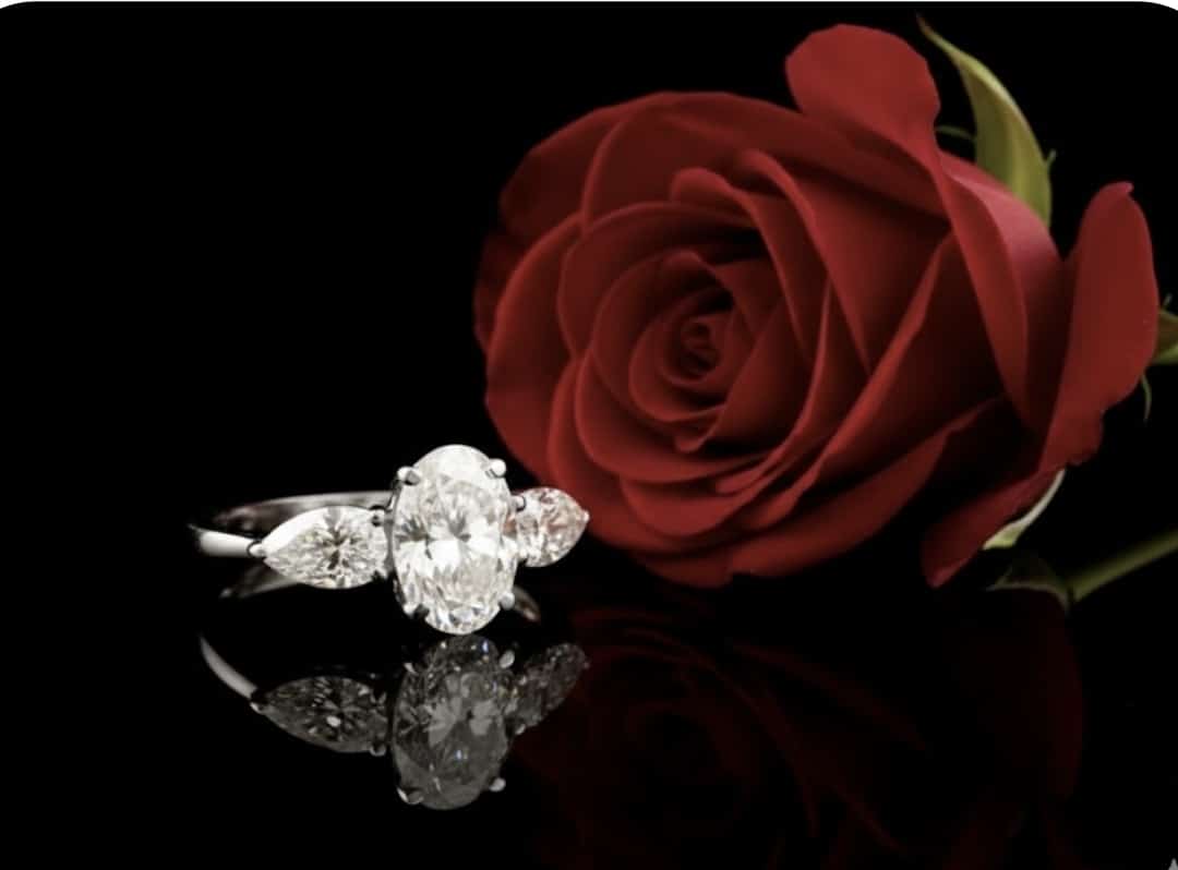 טבעת יהלומי מעבדה יוקרתית בעיצוב אלגנטי ומרשים, עם יהלום מרכזי אובל במשקל 1 קראט ושני יהלומי צד בצורת טיפה במשקל כולל של 0.36 קראט. שילוב האבנים יוצר מראה נשי, זוהר ובעל נוכחות ייחודית.
