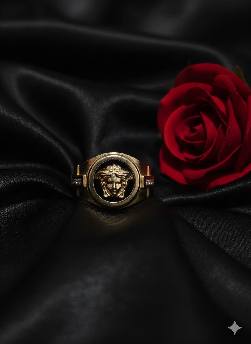 הטבעת משלבת את סמל המדוזה המיתולוגי, המפוסל בזהב 14 קראט ברמת דיוק מדהימה, כשהוא מונח על רקע שחור עמוק ומבריק. הניגודיות הזו יוצרת מראה דומיננטי ומתוחכם שמשדר יוקרה אירופאית קלאסית.