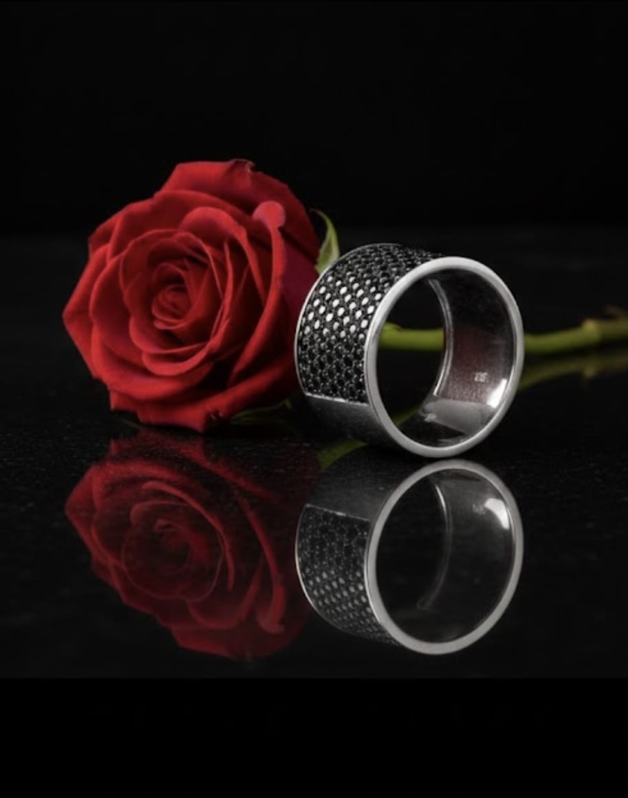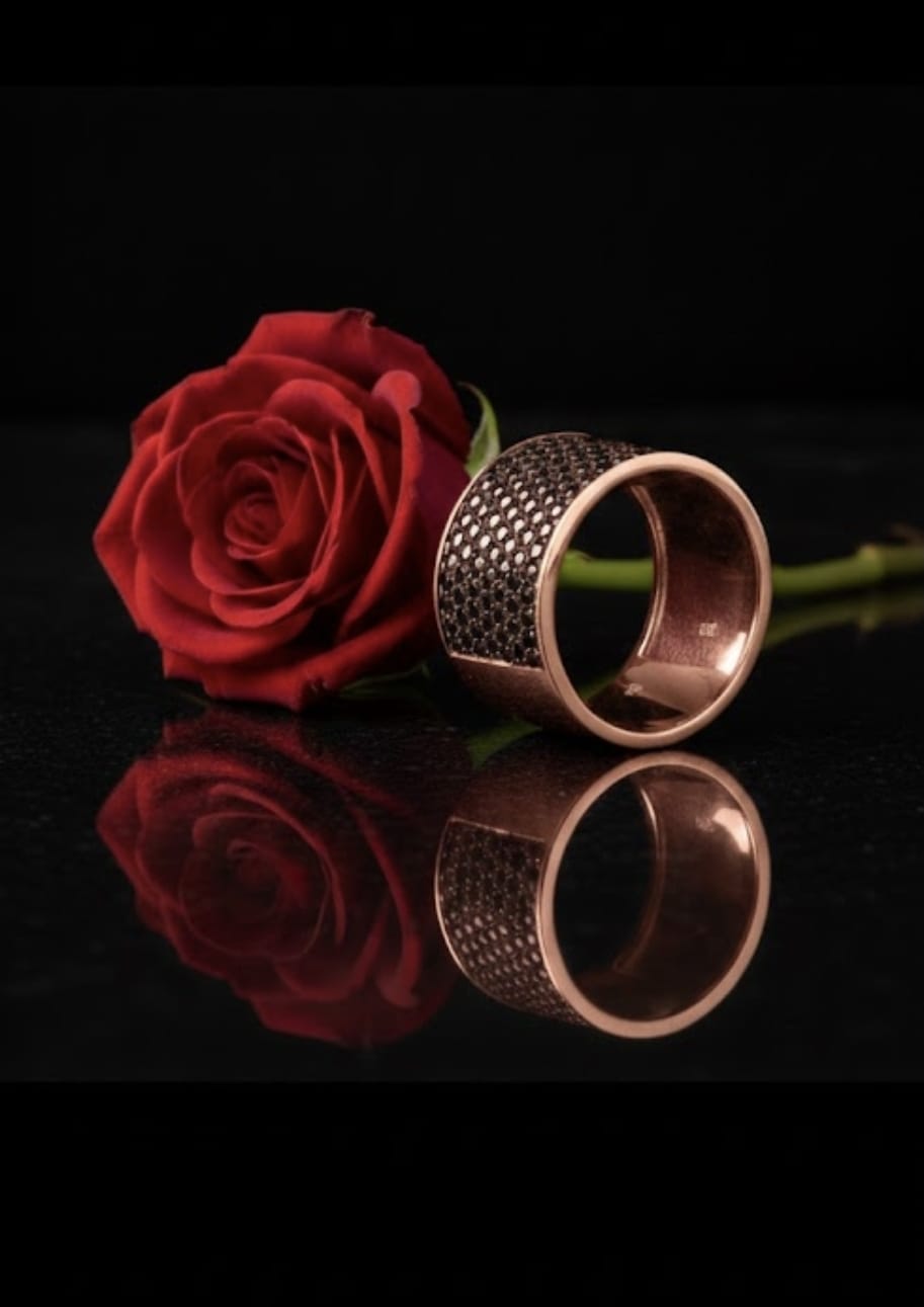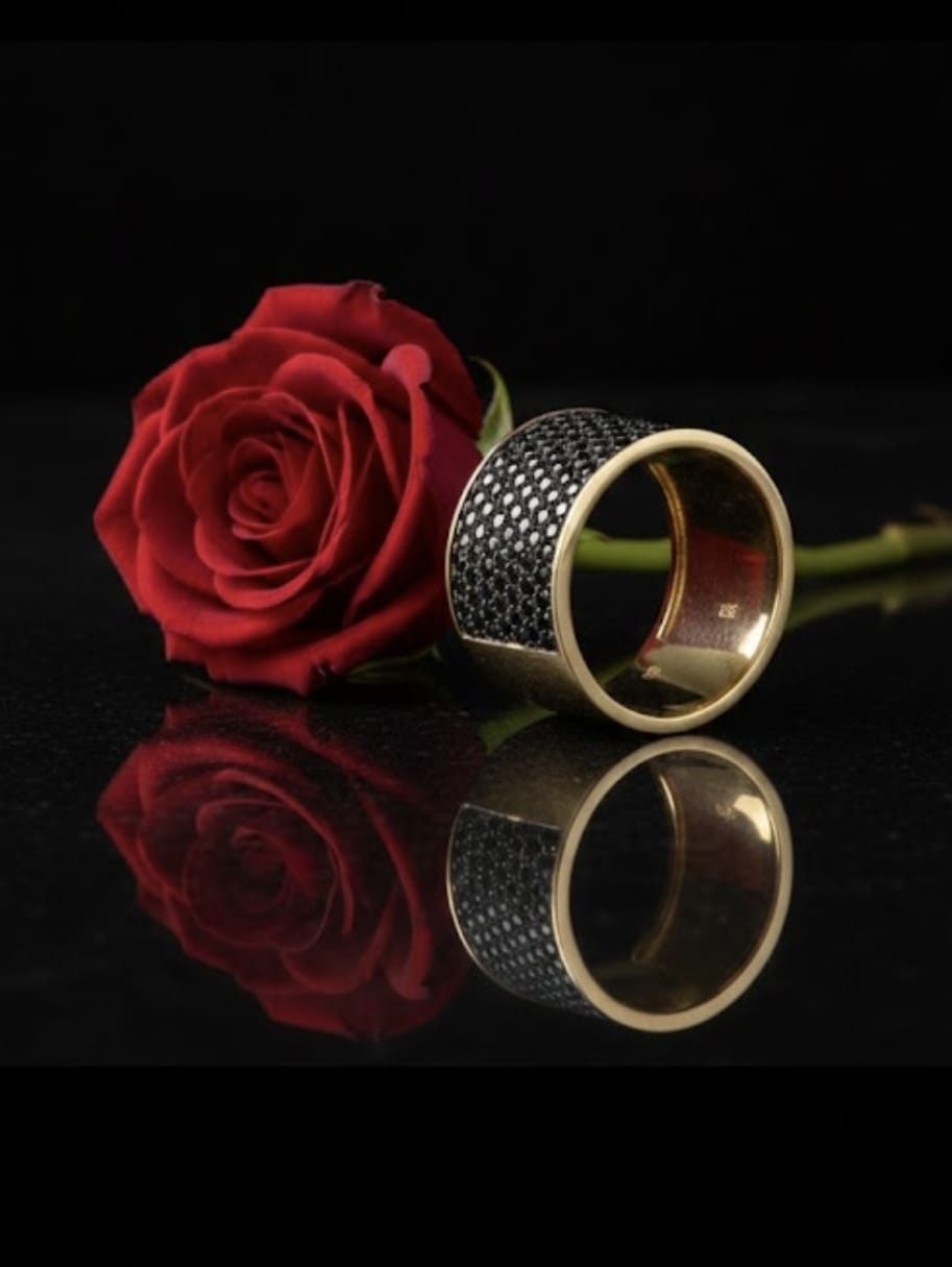 טבעת זהב בעיצוב ייחודי ועוצמתי, משובצת אבנים שחורות בשבע שורות צפופות, היוצרות מראה דרמטי, מודרני ובעל נוכחות חזקה. עיצוב מוקפד שמדגיש סטייל נועז עם קווים נקיים ואלגנטיים.