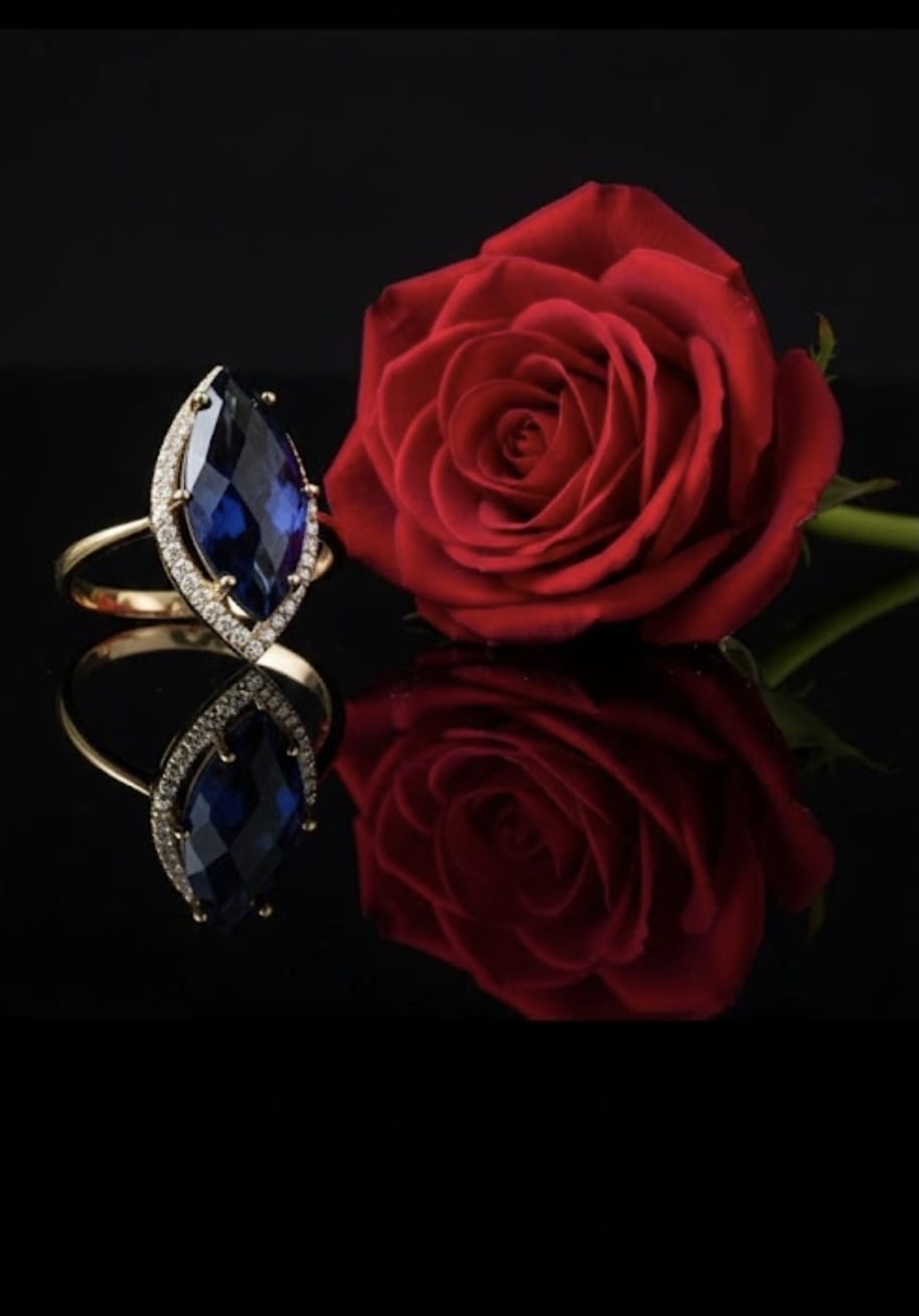 טבעת אלגנטית ובעלת נוכחות עשויה זהב צהוב 14 קראט, משובצת אבן זירקון כחולה מרכזית המוקפת בזירקונים לבנים מנצנצים. שילוב יוקרתי שמדגיש עומק, צבע וברק בעיצוב קלאסי ועל־זמני.