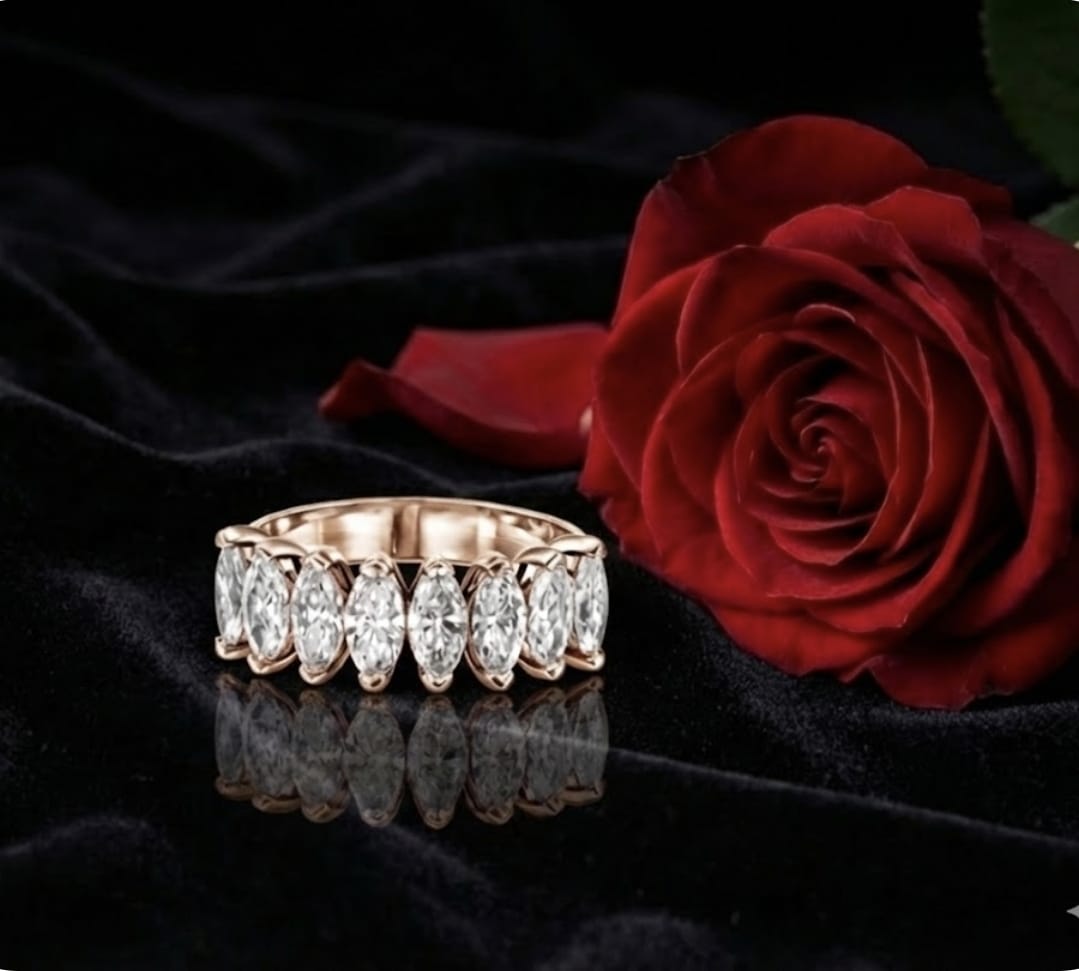 טבעת זהב יוקרתית בזהב 14 קראט, משובצת בשבעה יהלומים בחיתוך מרקיזה, היוצרים מראה אלגנטי, מאורך ובעל נוכחות מרשימה. משקל יהלומים כולל של 3.88 קראט מעניק ברק ועומק יוצאי דופן.