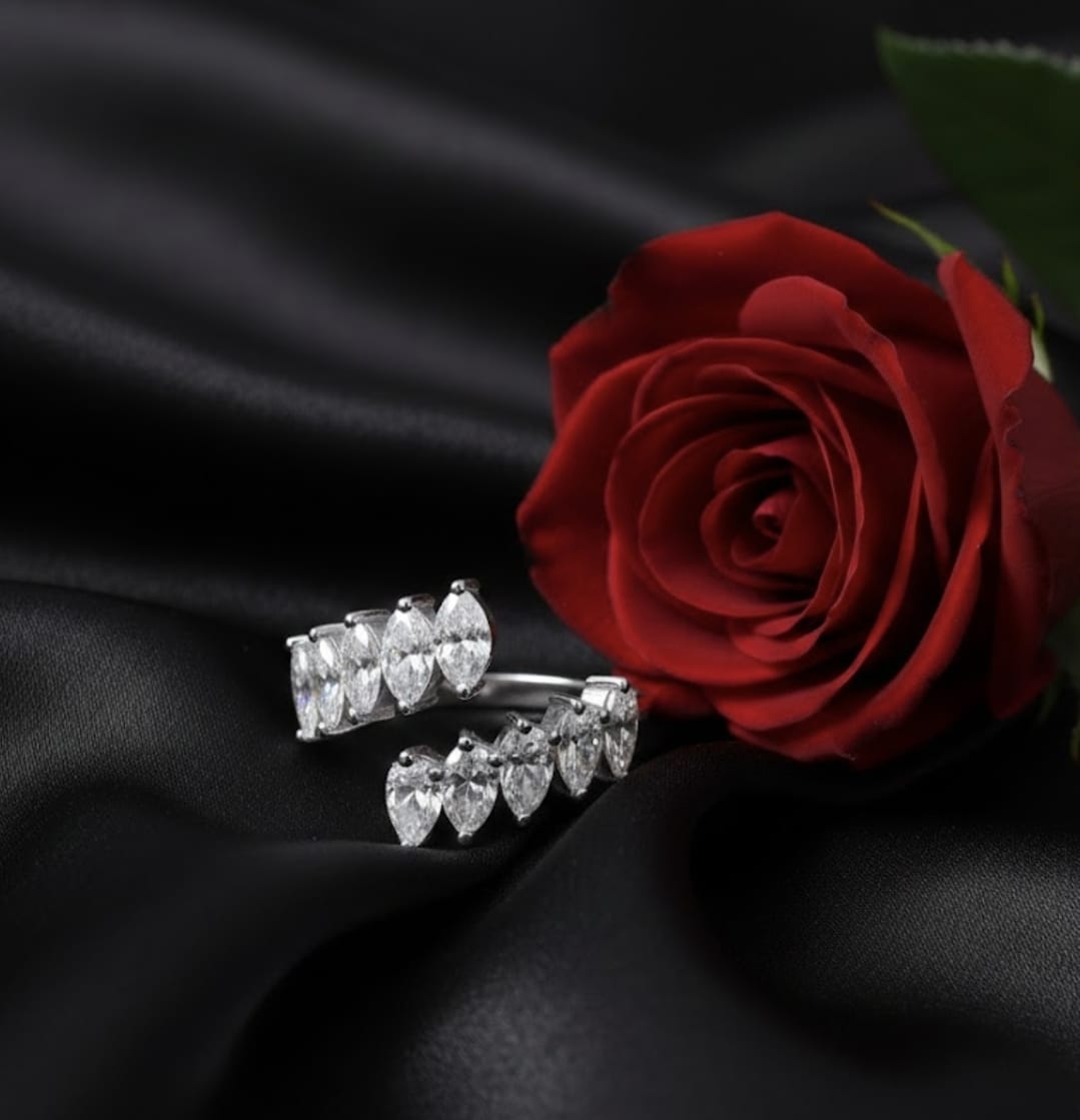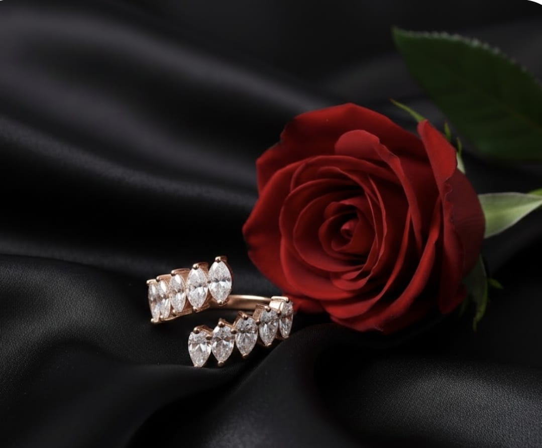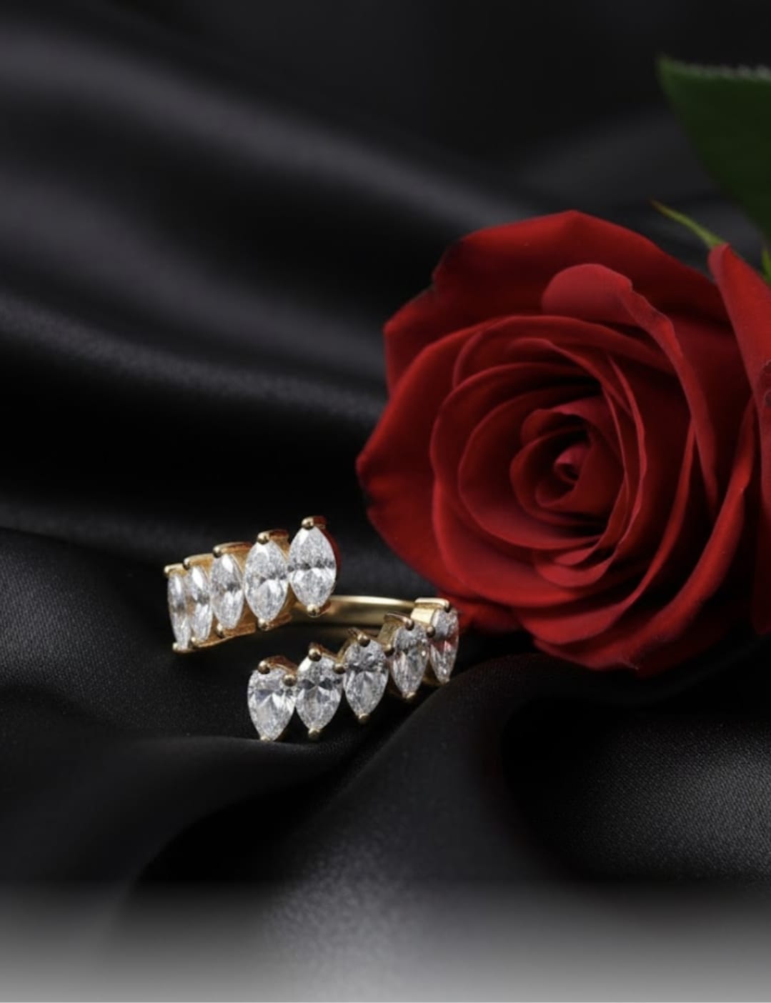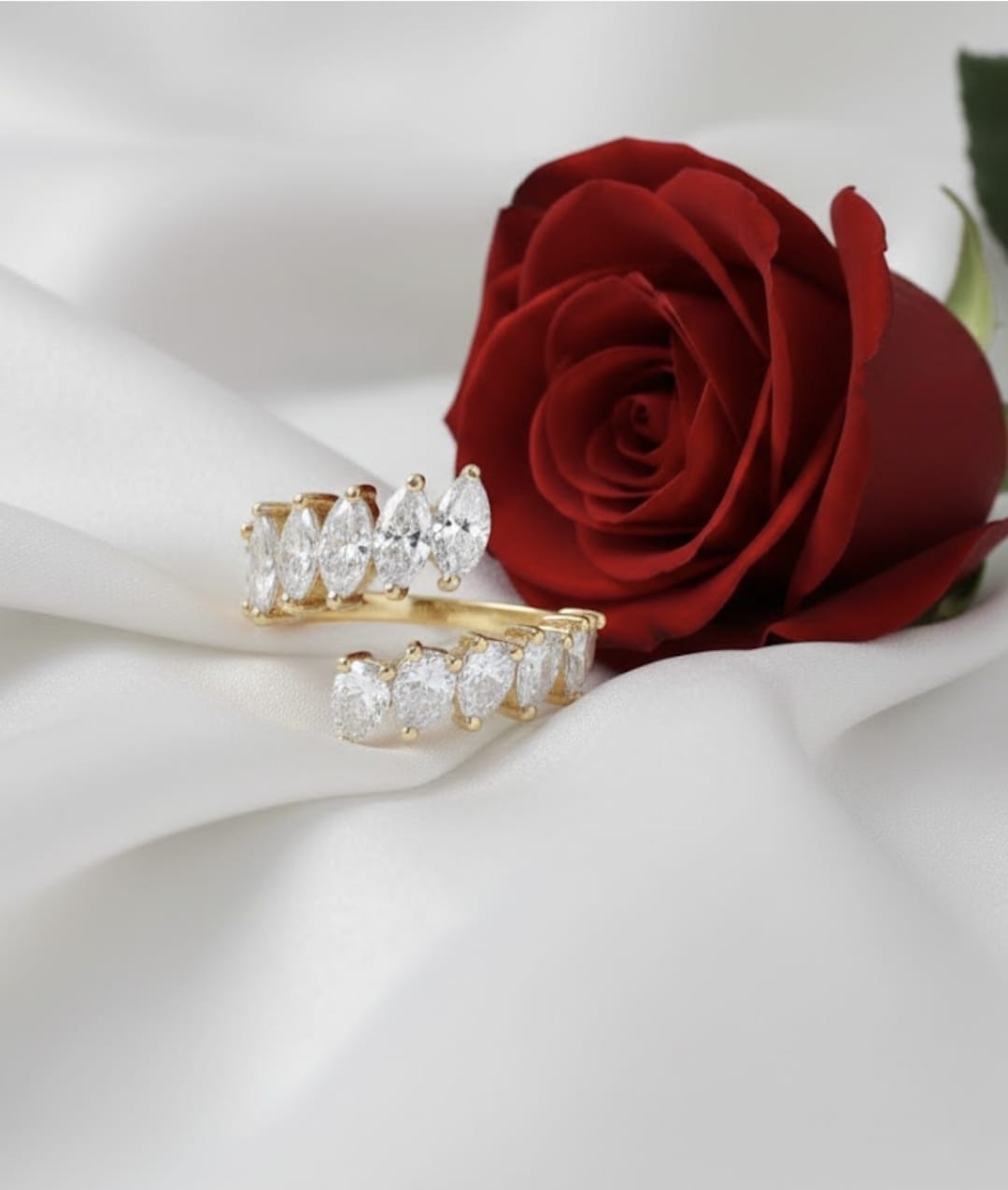 טבעת יהלומי מעבדה יוקרתית בזהב 14 קראט, בעיצוב ספירלה פתוחה ואלגנטית, משובצת בשתי שורות של יהלומי מעבדה בחיתוכי מרקיזה וטיפה, ליצירת מראה זורם, עשיר ובעל נוכחות ייחודית.