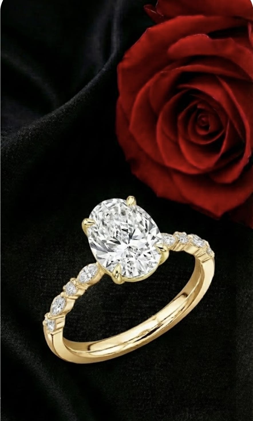 טבעת זהב יוקרתית בזהב 14 קראט, משובצת יהלום מרכזי בחיתוך אובל במשקל 3 קראט, בשילוב יהלומי צד בחיתוכי מרקיזה ועגול, היוצרים מראה עשיר, מאוזן ואלגנטי במיוחד.