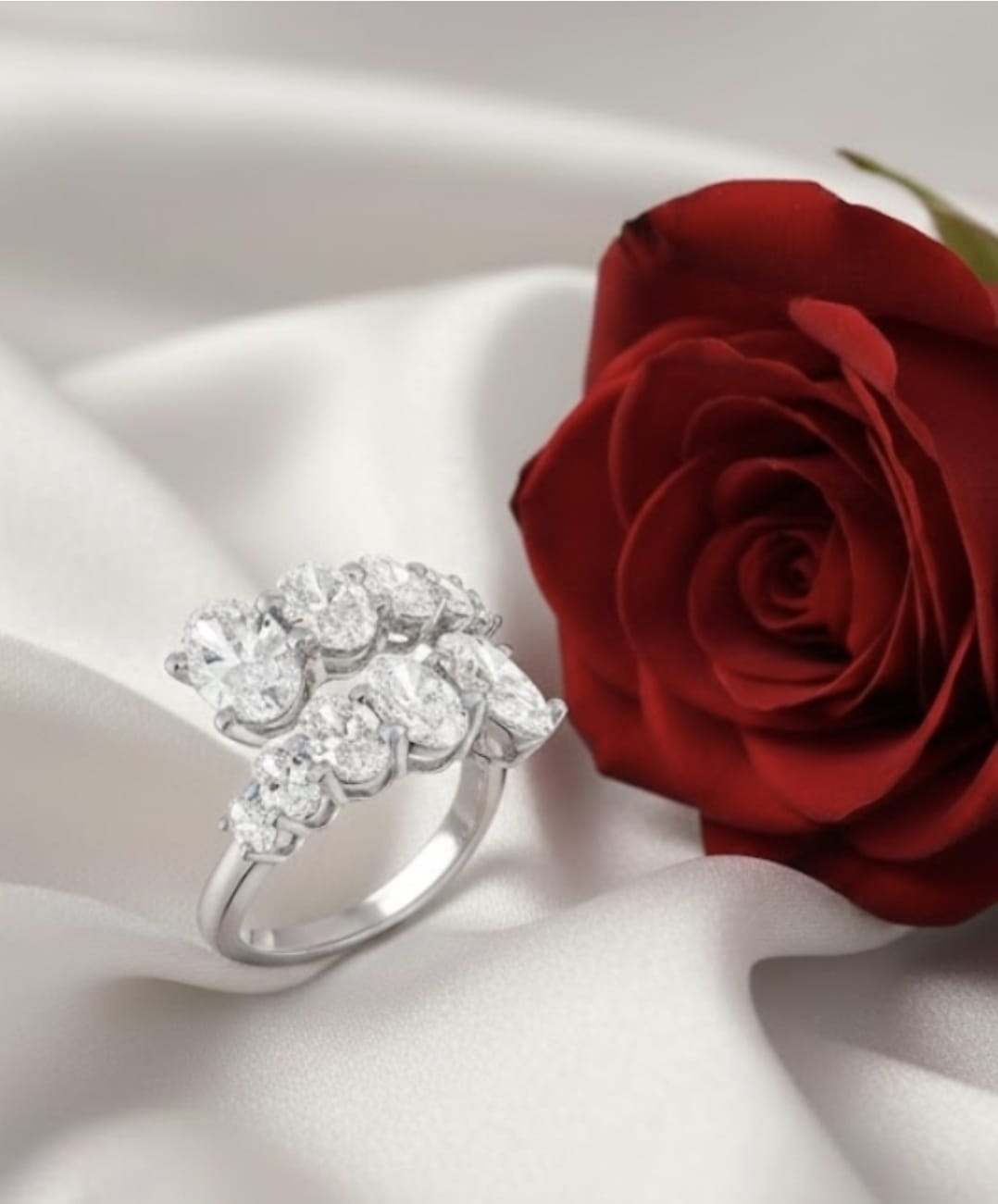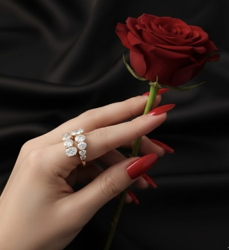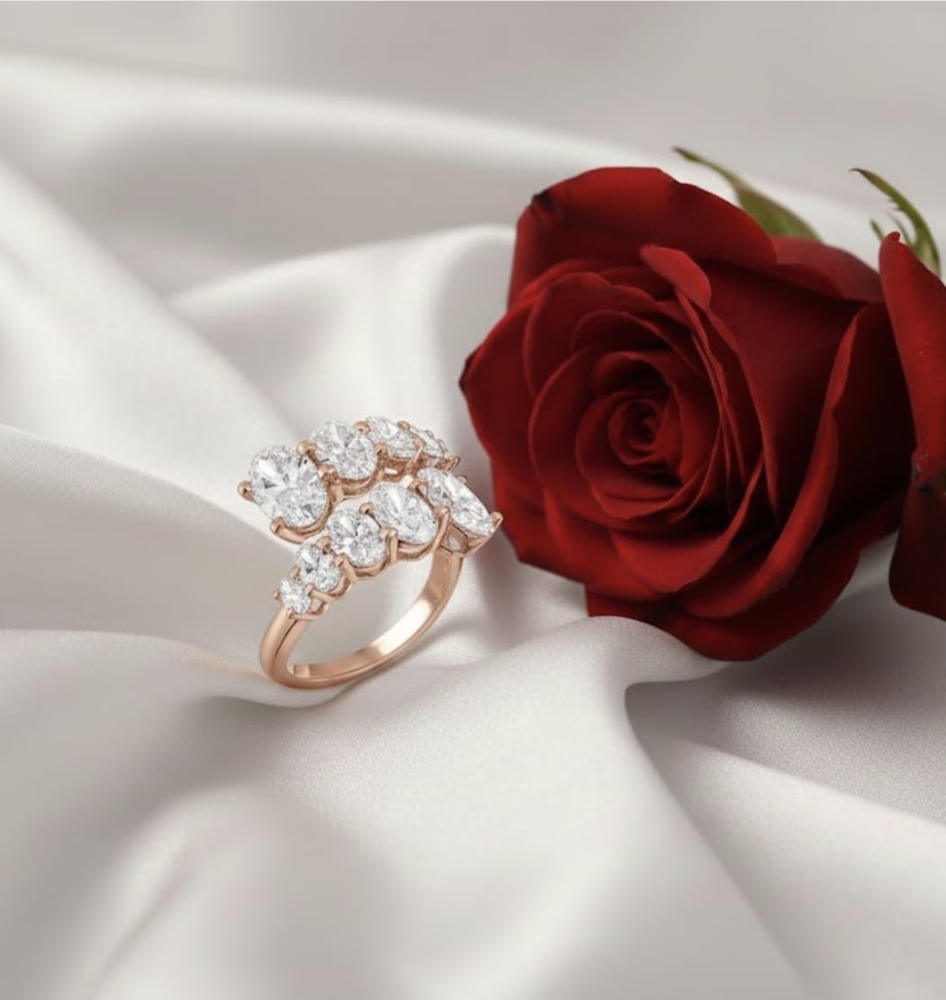 טבעת זהב 14 קראט בעיצוב יוקרתי ומרשים, משובצת 10 יהלומי מעבדה בחיתוך אובאלי בגדלים משתנים, המסודרים בצורת דגראדה ליצירת זרימה טבעית ונוכחות אלגנטית. משקל יהלומים כולל של 3.18 קראט מעניק ברק ועומק יוצאי דופן.