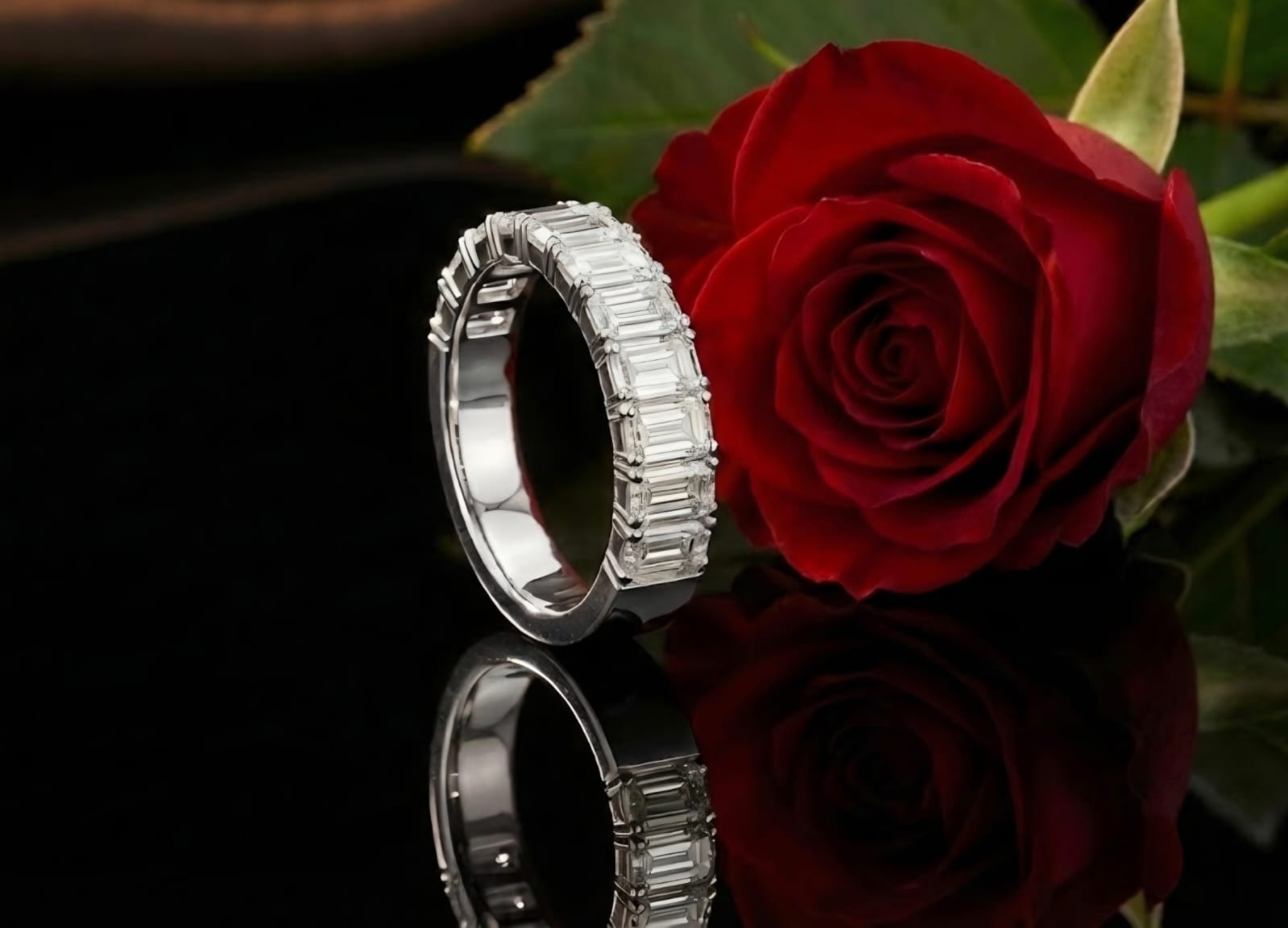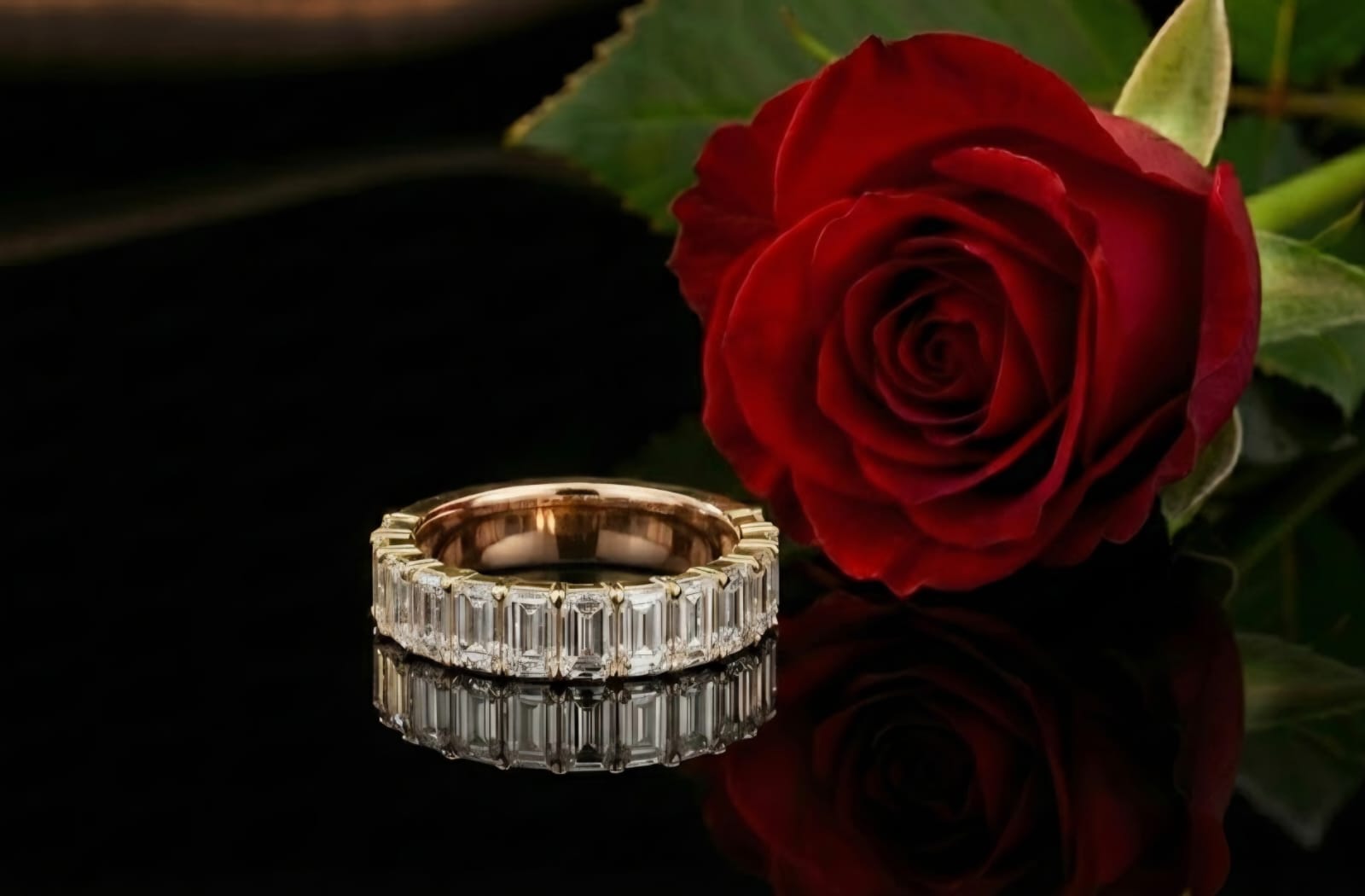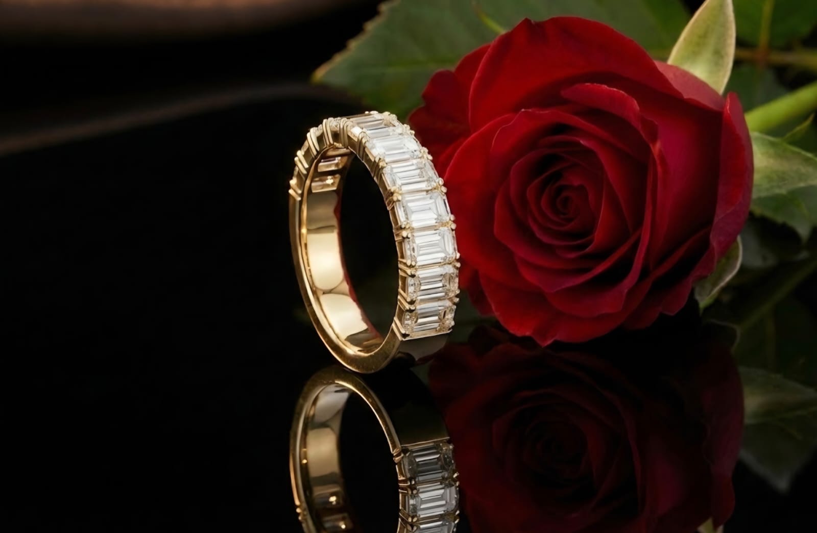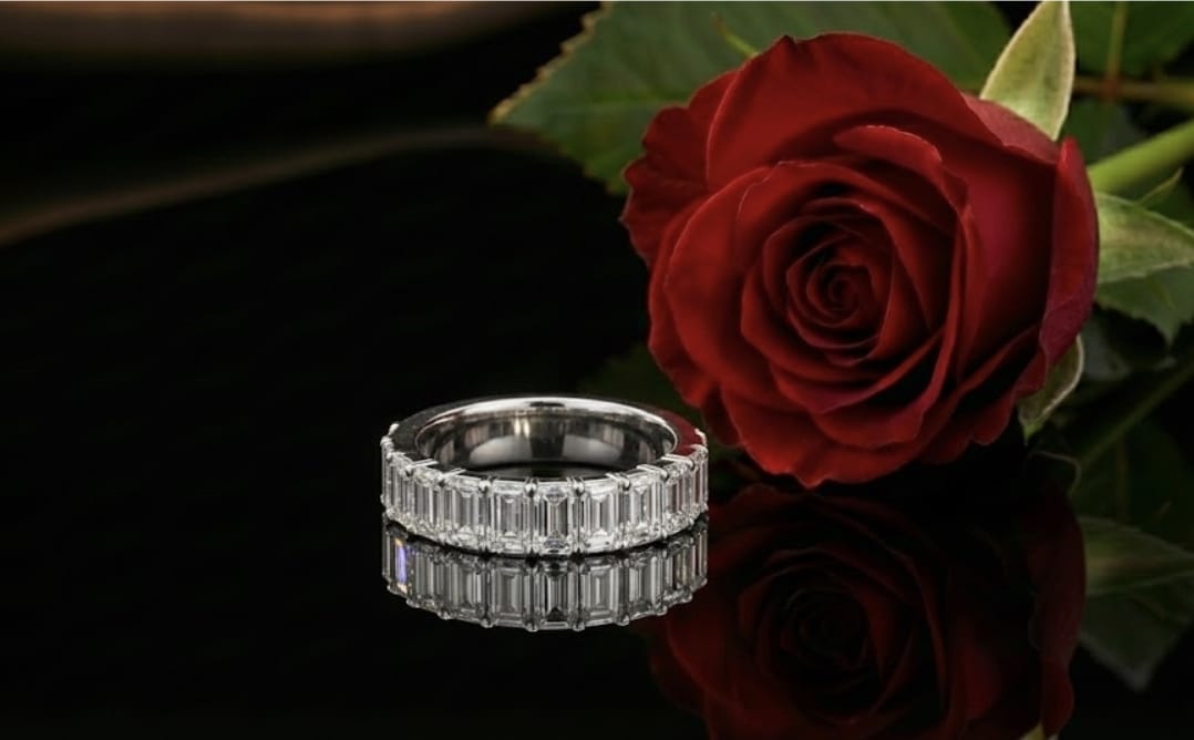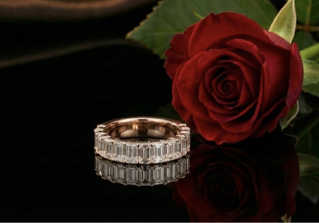טבעת חצי איטרניטי יוקרתית בזהב 14 קראט, משובצת יהלומים בחיתוך אמרלד, היוצרים מראה נקי, אלגנטי ועל־זמני. משקל יהלומים כולל של 4.07 קראט מעניק ברק עמוק ונוכחות מרשימה תוך שמירה על קווים מאוזנים.