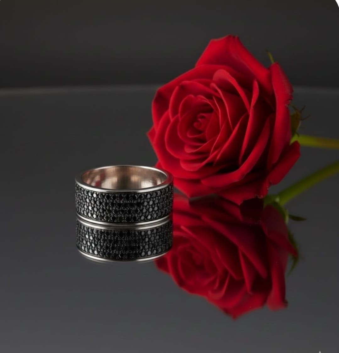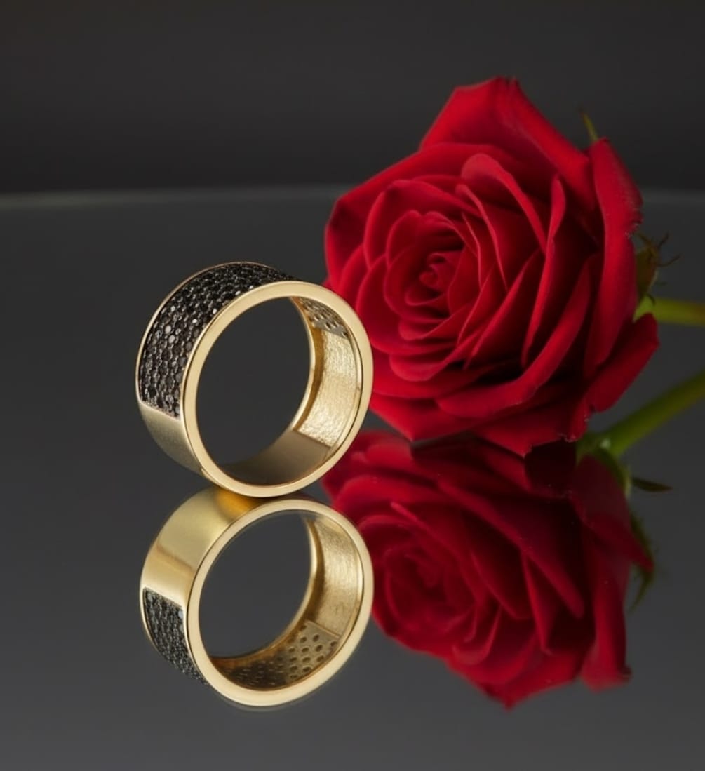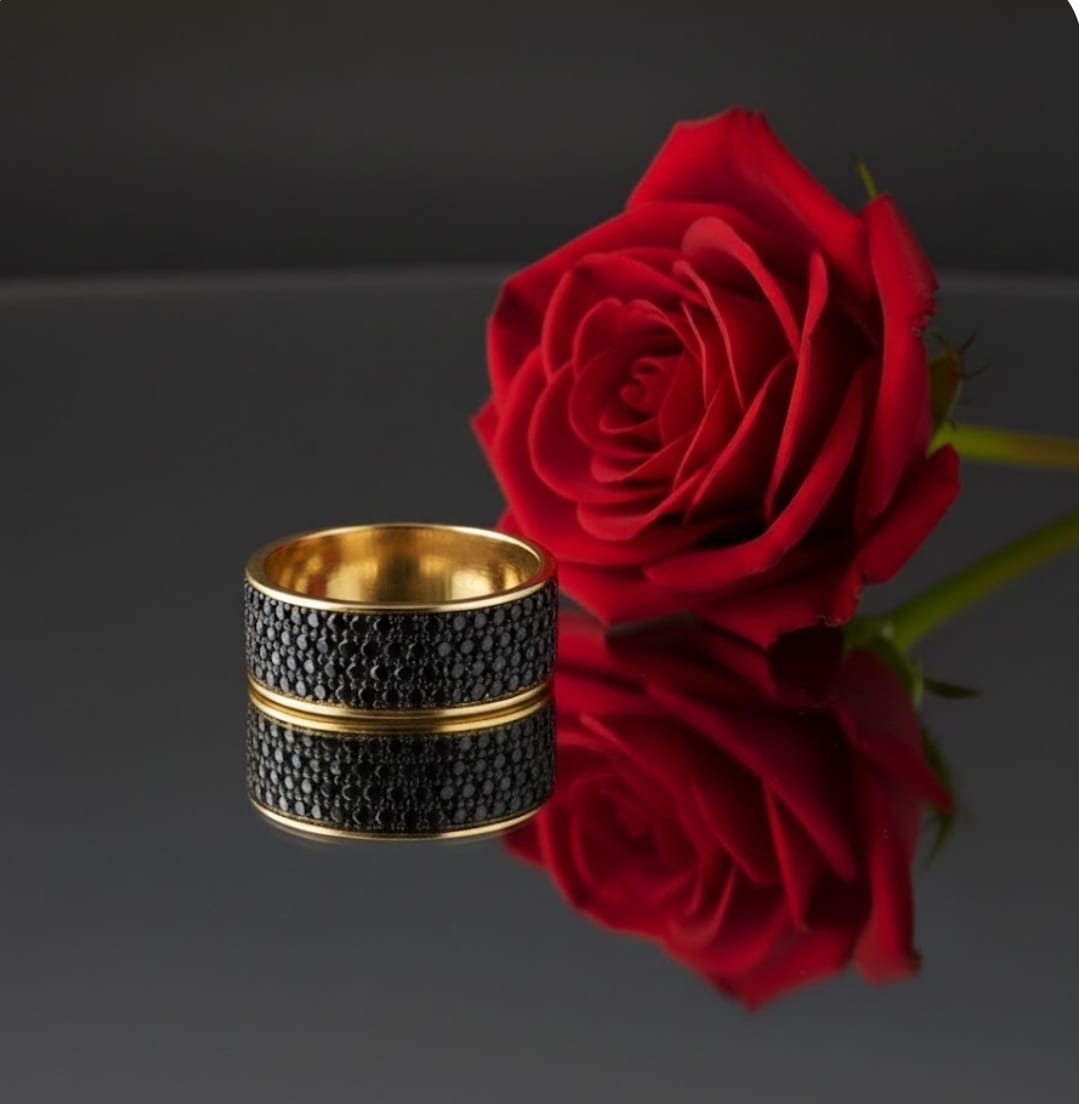 טבעת זהב 14 קראט מרשימה ובעלת נוכחות חזקה, משובצת אבנים שחורות בחמש שורות צפופות היוצרות מראה יוקרתי, עמוק ועוצמתי.