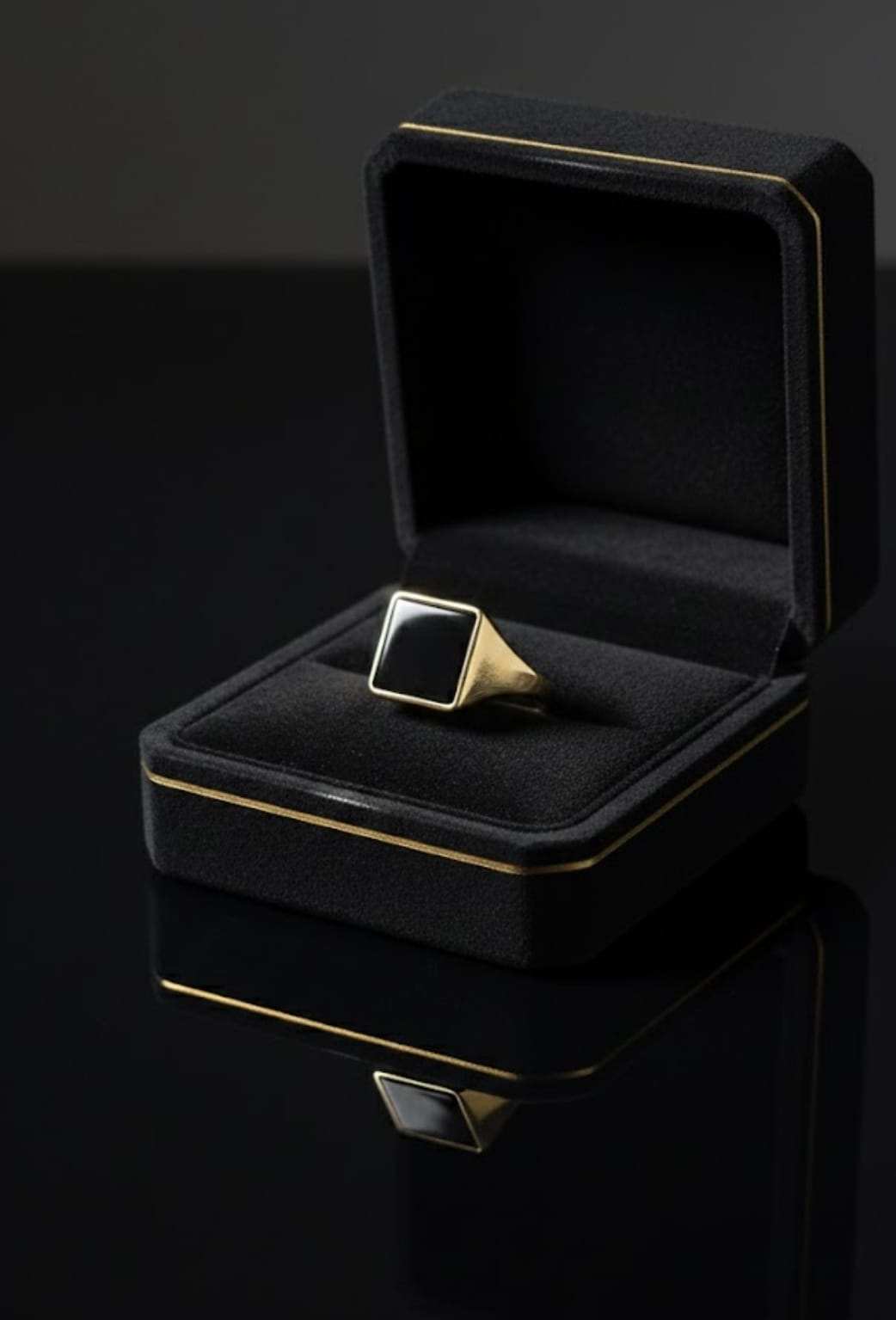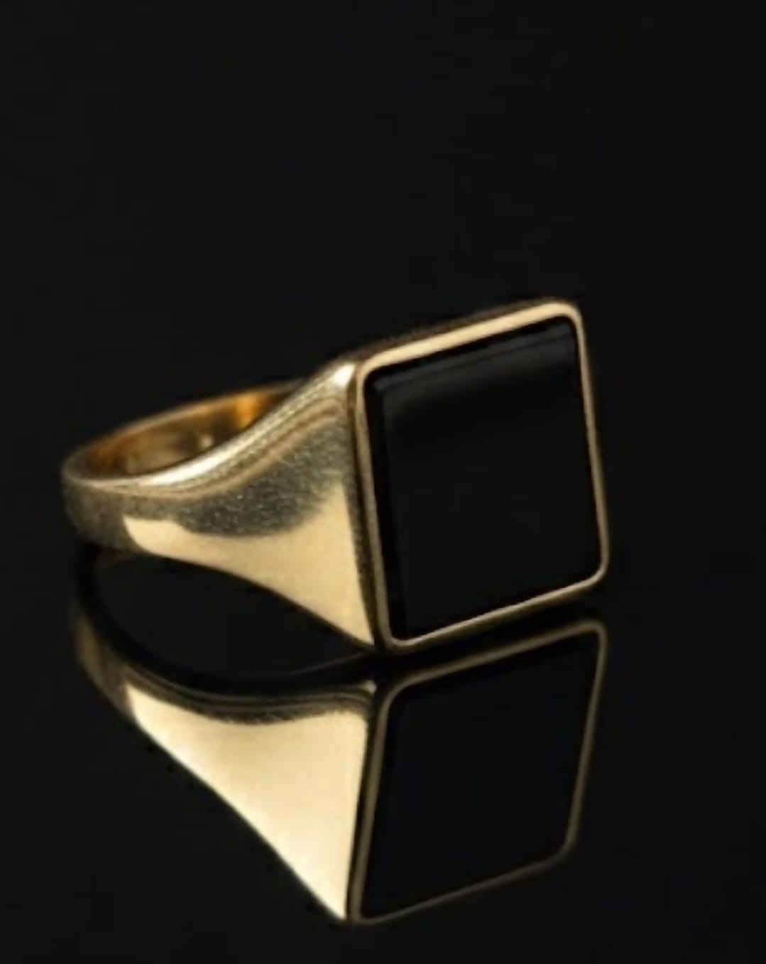 בלב הטבעת שוכן משטח מרובע של אבן אוניקס שחורה, מלוטשת לרמת ברק גבוהה שיוצרת השתקפות עמוקה ויוקרתית. הזהב הצהוב ב-14 קראט עוטף את האבן בקווים ישרים ונקיים, ללא הסחות דעת, מה שמאפשר לאיכות החומרים לדבר בעד עצמה.