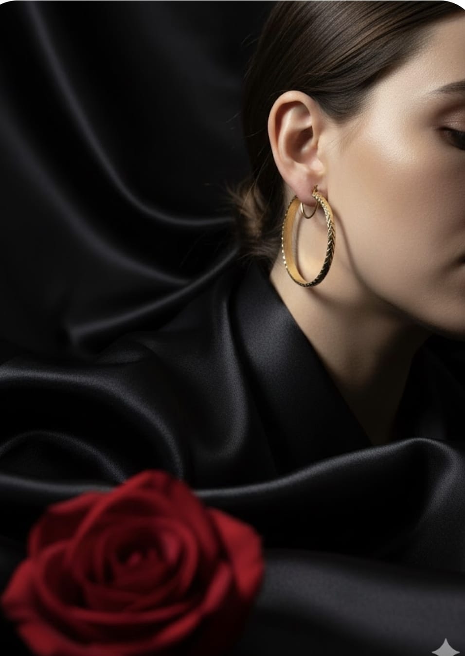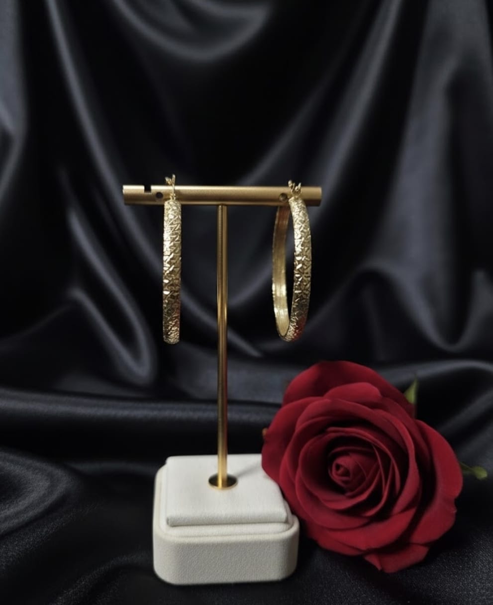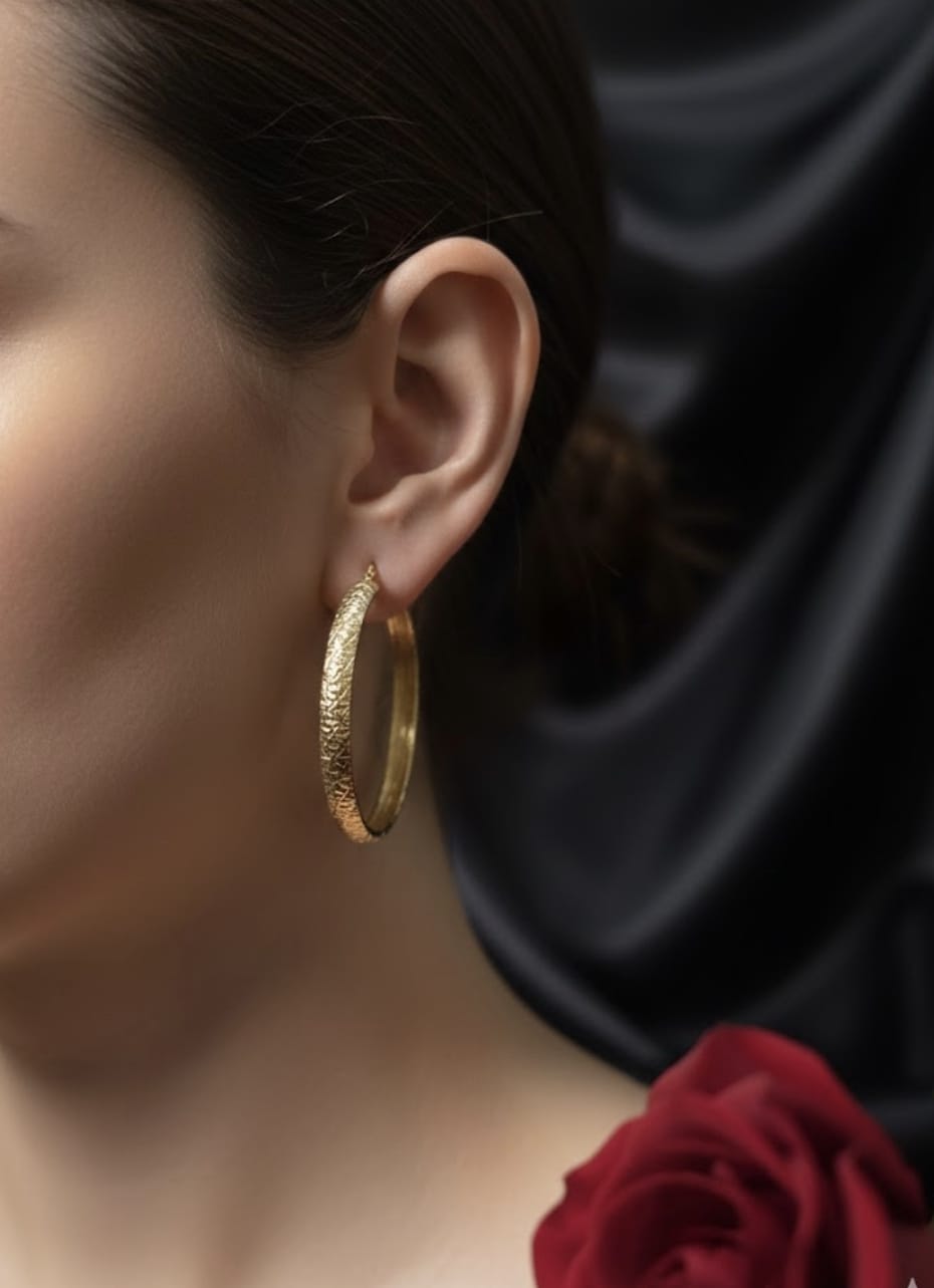 עגילי חישוק מזהב 14 קראט עם חריטת יהלום יוקרתית, המעניקה ברק ייחודי ומראה עשיר ומרשים. הקוטר 3.8 ס״מ והרוחב 4 מ״מ יוצרים נוכחות אלגנטית תוך שמירה על איזון מושלם בין סטייל לנוחות.