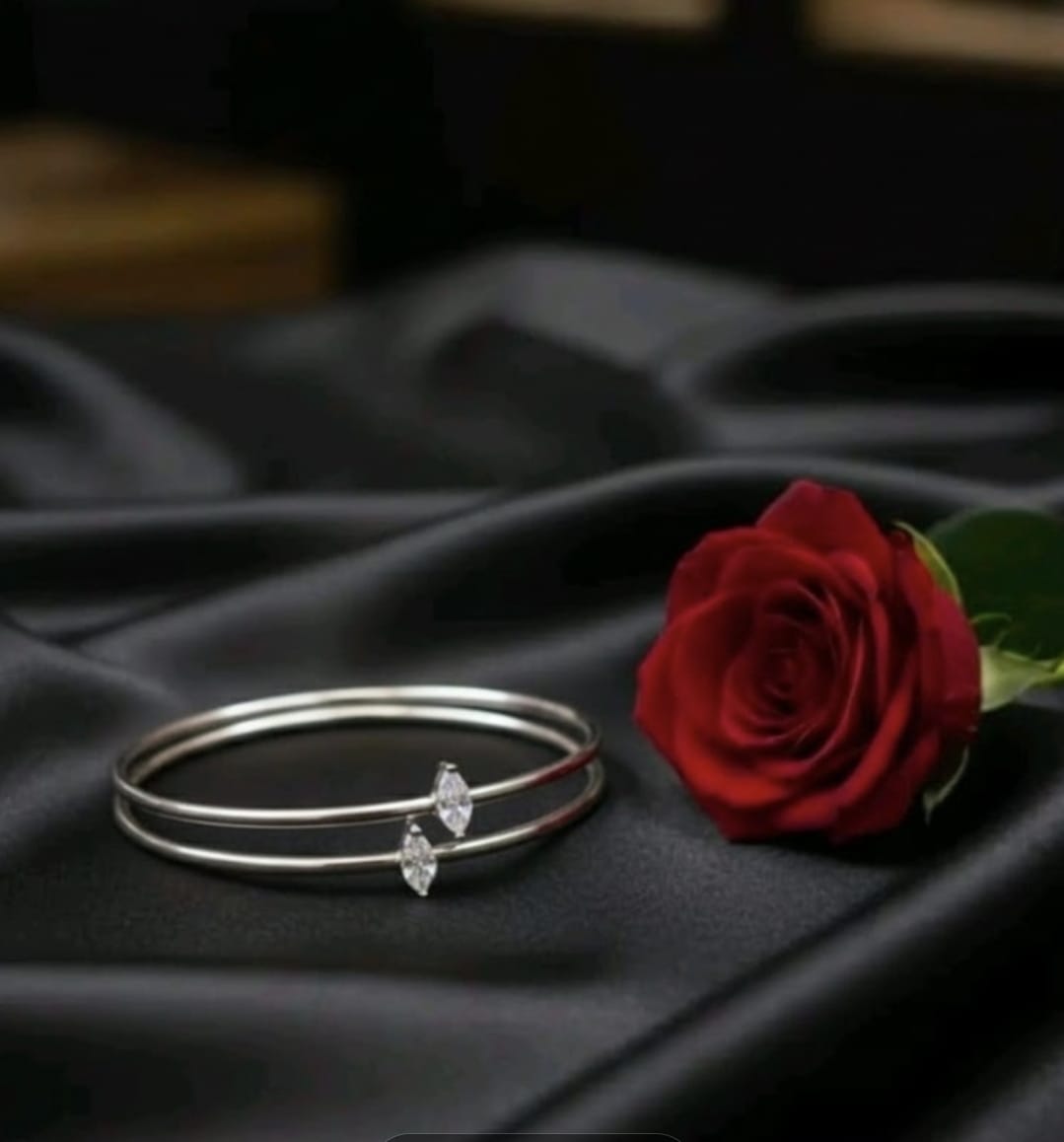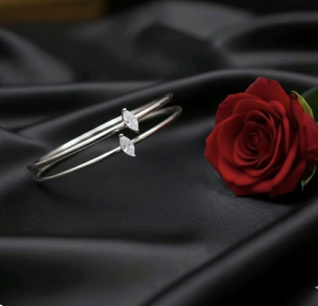 צמיד בנגל זהב לבן 14 קראט בעיצוב אלגנטי ובעל נוכחות, משובץ אבן זרקון בחיתוך מרקיזה המוסיפה ברק יוקרתי ומראה מתוחכם ועדכני. קוטר של 5.7–6.2 ס"מ לישיבה נוחה ומאוזנת על פרק היד.