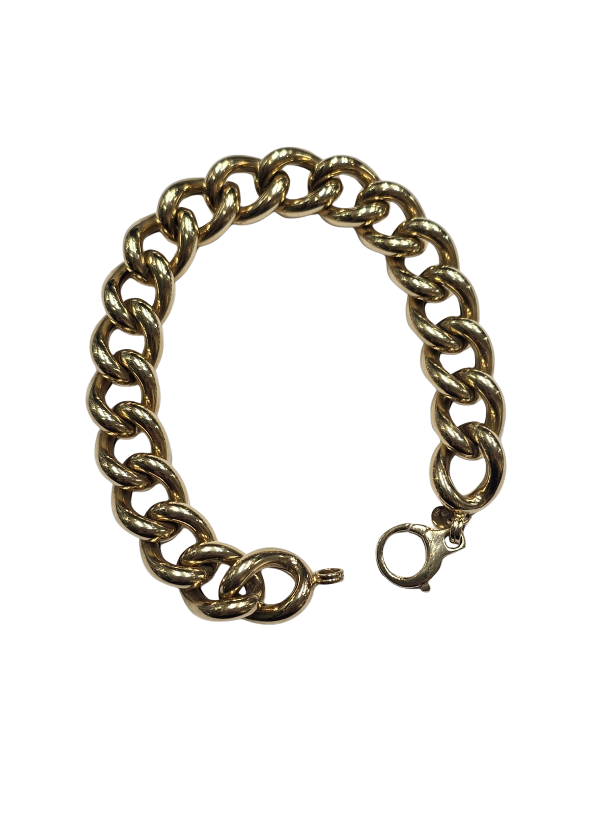 צמיד חוליות מזהב 14 קראט בעיצוב חזק וקלאסי, עשוי זהב איכותי במשקל 15.39 גרם המעניק נוכחות מרשימה ותחושת יוקרה על היד. אורך של 21 ס״מ מספק התאמה נוחה ומראה מאוזן.