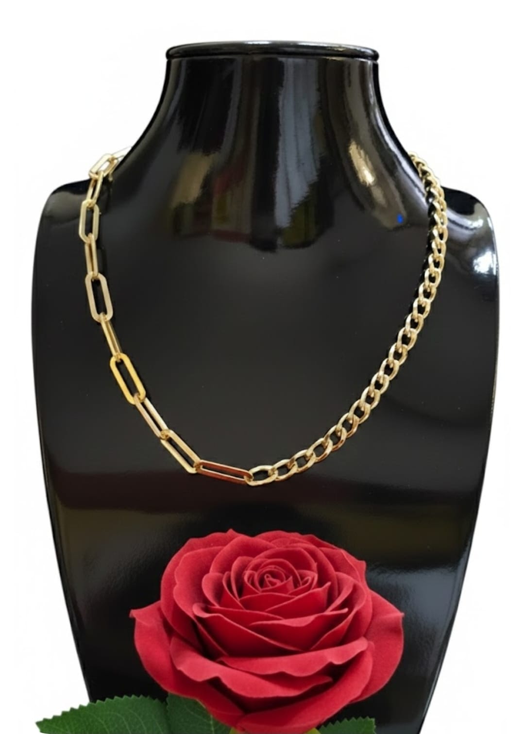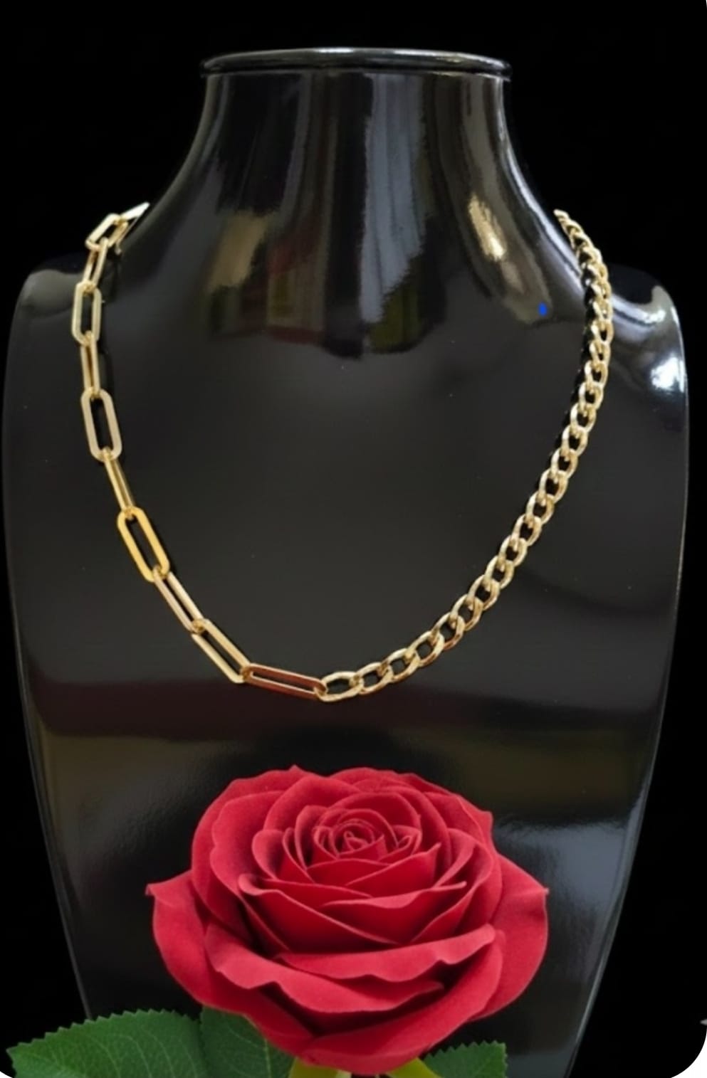 מה שהופך את השרשרת הזו למיוחדת הוא עיצוב ה-Half & Half המתוחכם: צד אחד מורכב מחוליות מלבניות (Paperclip) מודרניות ופתוחות, המעניקות מראה קליל ועכשווי, בעוד הצד השני מציג עיצוב גורמט קלאסי, צפוף ויוקרתי המעניק לשרשרת את המסה והברק המסורתי.